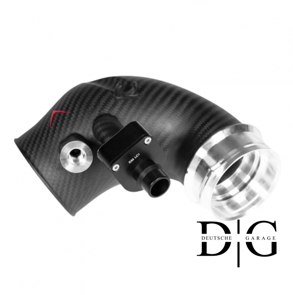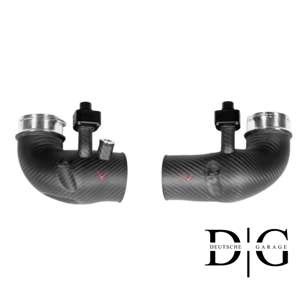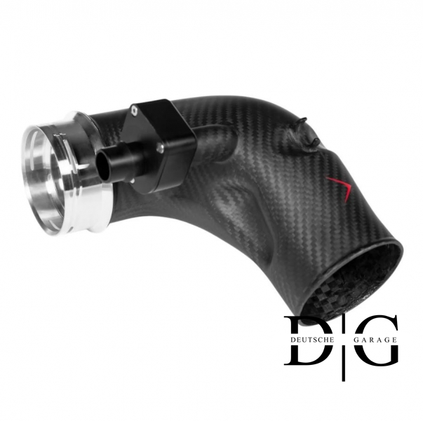 Ідеальне доповнення до впускної системи BMW M5 (G90/G99)- впускні патрубки EVENTURI призначені для оптимізації потоку повітря безпосередньо до турбонагнітачів. Стандартні патрубки зменшуються в діаметрі одразу після з’єднання з впуском, що створює обмеження, особливо при підвищеному тиску наддуву. Карбонові патрубки EVENTURI усувають це звуження, зберігаючи більшу та постійну площу перерізу, що дозволяє забезпечити більший об’єм повітря перед турбінами. Вигини всередині конструкції оптимізовані для зменшення опору, забезпечуючи плавний та ефективний потік. Виготовлені з термостійкого препрег-карбону з фрезерованими фланцями, патрубки також покращують зовнішній вигляд моторного відсіку.